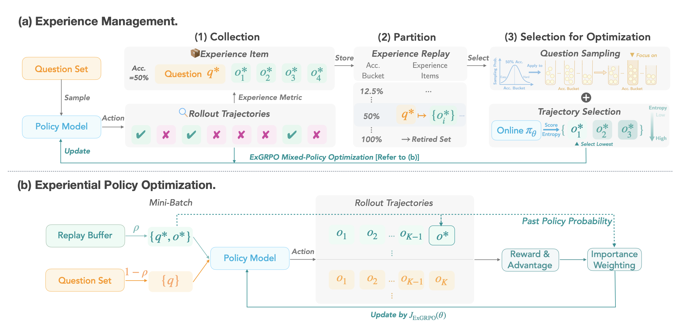 We investigate what makes a reasoning experience valuable and identify rollout correctness and entropy as effective indicators of experience value. Based on these insights, we prioritize valuable experiences with a mixed-policy objective to balance exploration with experience exploitation.